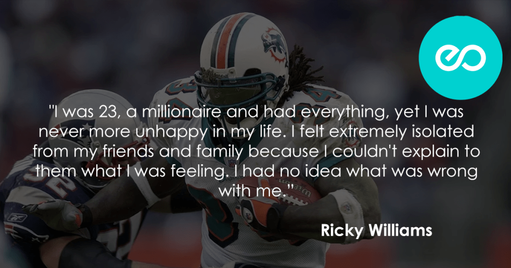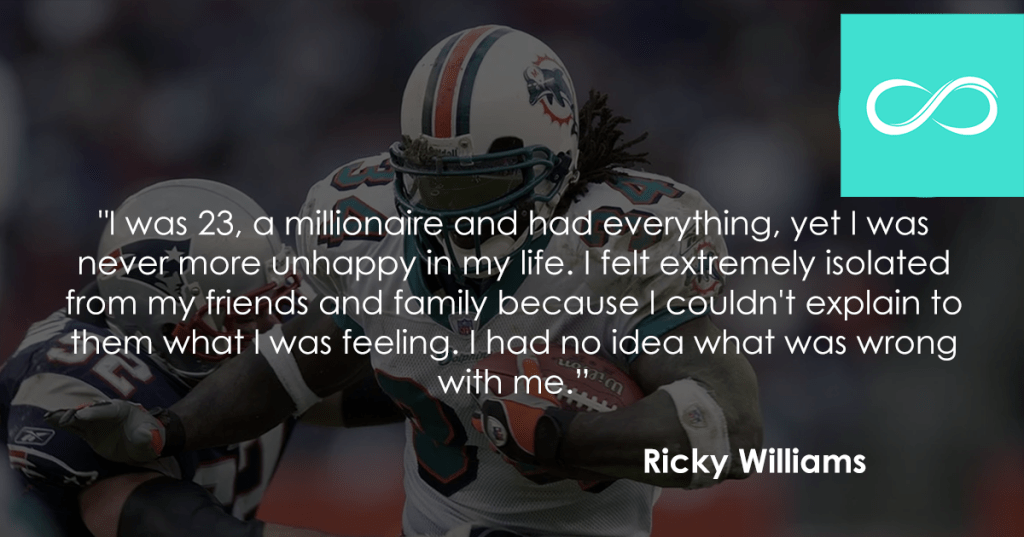 Ricky Williams : I was 23, a millionaire and had everything, yet I was never more unhappy in my life. I felt extremely isolated from my friends and family because I couldnāt explain to them what I was feeling. I had no idea what was wrong with me.